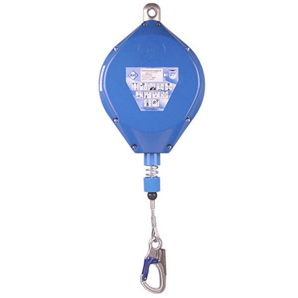 Inertia Reel type fall arrester housed within durable and sturdy plastic housing with 24 metre galvanized steel rope lifeline.