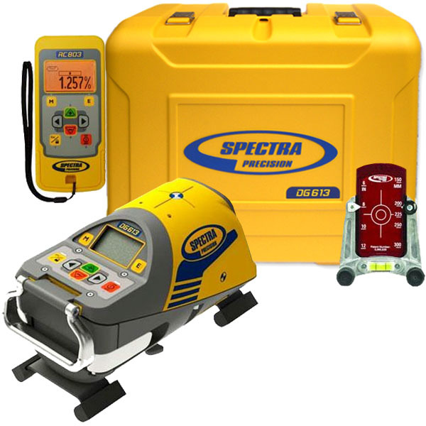 | Spectra Precision DG613 Pipe Laser | DG613 laser, RC803 remote control, optically enhanced target set, large target plate, rechargeable NiMH pack & charger, calibration sticker, shockwatch, test calibration certificate, user manual and hard carry case. |