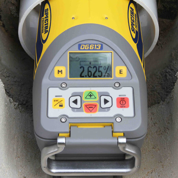 The DG613 has a grade range from -12% to +40% and is fully self-leveling over the entire grade range. Even the cross axis is fully compensated - providing quick set up and peace of mind that the laser will be level without having to adjust at the bottom of the invert.