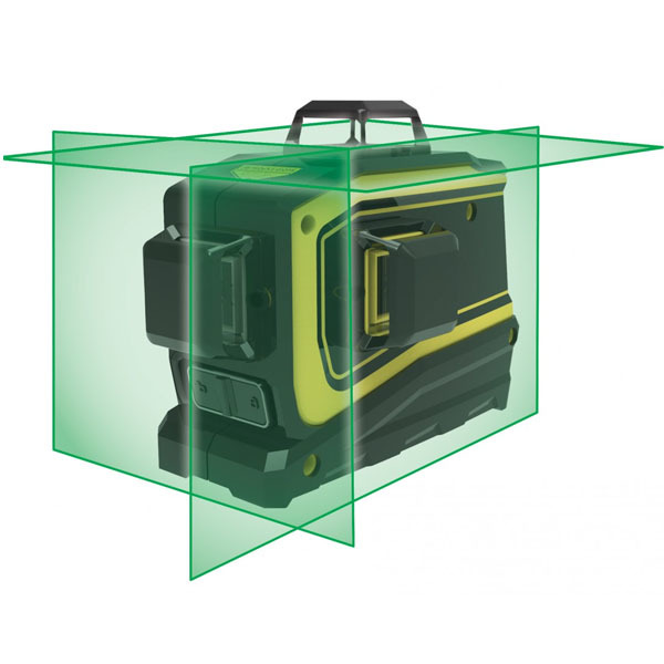 The 2 vertical green beams are 90° apart. They can be used for 90° layout, plumb work and floor-to-ceiling point transfer.