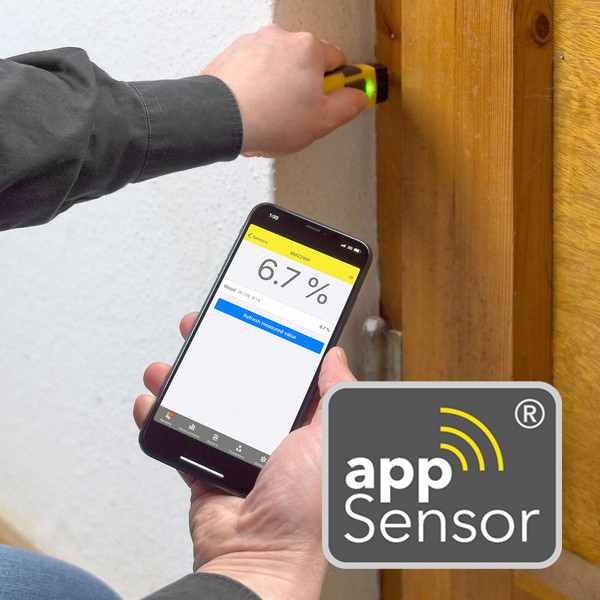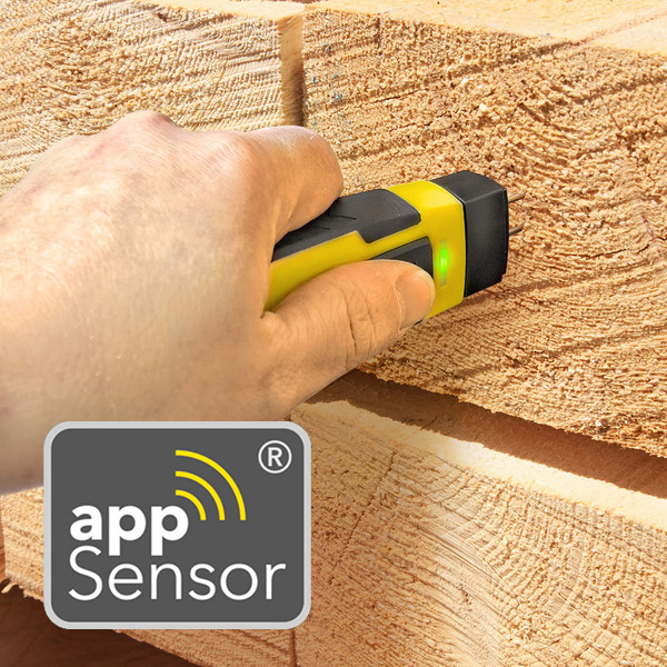 Compact and versatile Bluetooth enabled resistance pin-type moisture meter for measuirng moisture% of timber and wood, used in conjunction with Trotec's iOS and Android compatible MultiMeasure Mobile smartphone app.