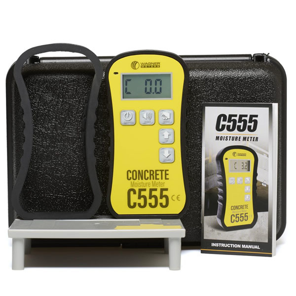 | Wagner C555 Concrete Moisture Meter | Standard package includes: C555, rubber boot protector, paired traceable test calibration block, 1x 9V alkaline battery, operating manual hard case. |