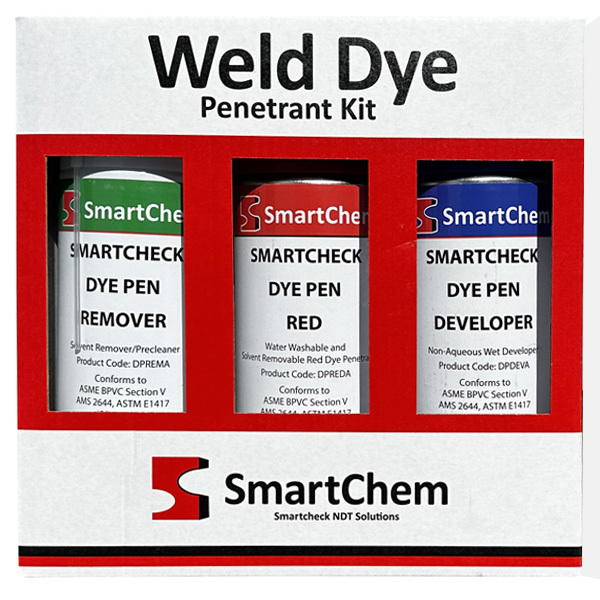 Boxed 3 pack including 1x Smartcheck Dye Pen Red, 1x Smartcheck Dye Pen Developer and 1x Smartcheck Dye Pen Remover 300gm aerosols.