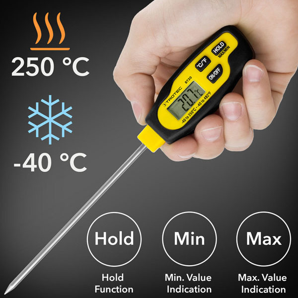 | Trotec BT20 Digital Thermometer | BT20, 1x LR44 battery, operating manual, protective sheath for probe |